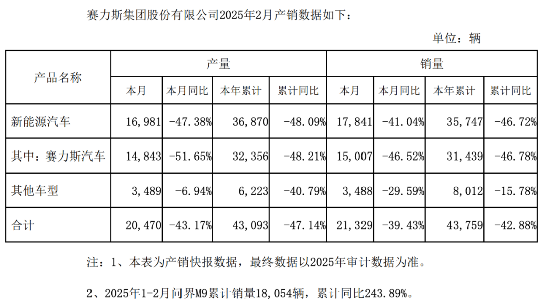值得关注的是,赛力斯的走势,与行业整体表现形成鲜明对比。根据中国汽车工业协会和流通协会公布数据,2025年2月,中国新能源汽车市场仍保持增长韧性。其中,比亚迪销量同比激增163.95%,小鹏、零跑销量增速更是超200%……赛力斯成为榜单中仅有的月度销量同比下滑的两家车企之一,其累计销量同比降幅,亦是上市车企之最。不过,好消息是,在赛力斯遭遇“至暗时刻”,问界M9却成为一抹亮色。